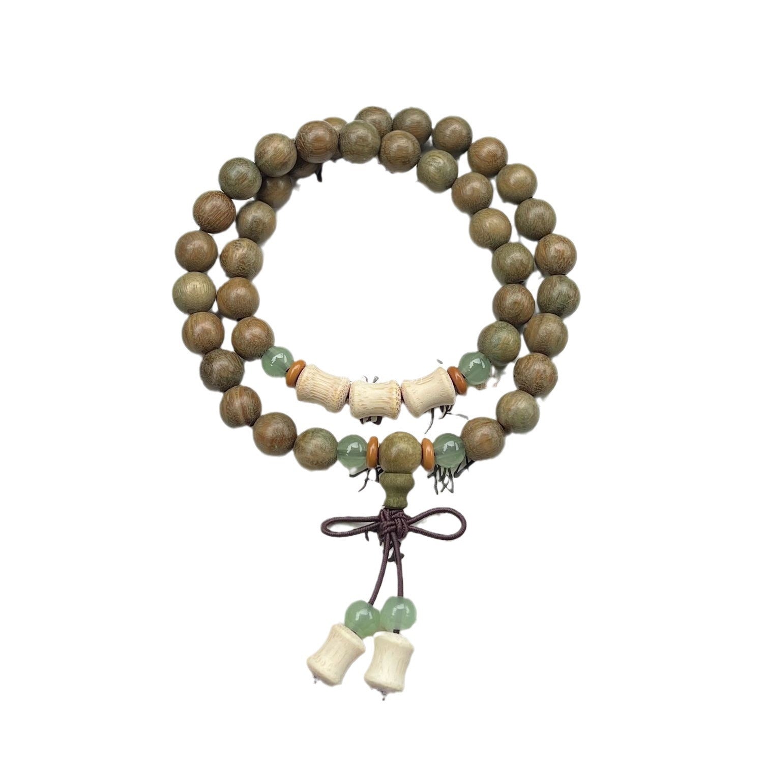 Rooted in the art of wenwan(Chinese cultural artifacts) and Buddhist prayer beads, this bracelet features a double-wrap design that adds depth and texture—worn loosely as a casual stack or tightened for a sleek, statement look. Each bead is carved from solid green sandalwood, a precious wood celebrated for its rich, earthy aroma and smooth, polished finish. The beads’ natural golden streaks mimic the elegant nodes of bamboo, a symbol of resilience and prosperity in Chinese culture—adding a subtle yet powerful storytelling layer to every wear.